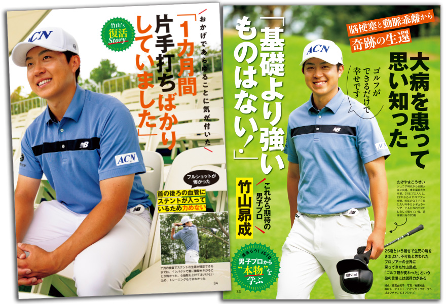 25歳という若さで脳梗塞と動脈乖離という病を患い生死の境をさまよった竹山昂成プロ。当時は復活は不可能と思われたプロツアーの世界にも戻ってきた竹山プロは「ゴルフ観が変わった」「1カ月間片手打ちばかりしていました」と語る。今回は、大病を患ってことで気づいたという基礎について話を聞かせてもらった。