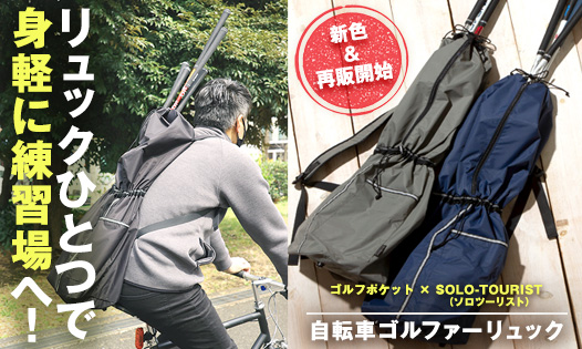 クラブを背負って練習場へGO!「自転車ゴルファーリュック」自転車で行ける距離に「練習場」のある方にイチオシのアイテム、それが「自転車ゴルファーリュック」。細長いリュックのような形状ですが、一番の特長はゴルフクラブをタテに収納できること。肩かけタイプのクラブケースを斜めに背負って自転車にのる方を稀に見かけますが、はるかに運転しやすく、周囲の迷惑にも断然なりにくいですよ!
