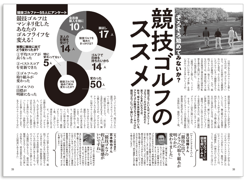 日頃の友人とのラウンドも楽しいけれど、長くゴルフをしていると訪れるマンネリ感。どこか刺激が足りないのも事実。そんなゴルファーにおすすめしたいのが競技ゴルフだ。競技ゴルフといえばアスリートがやるものだと思う人も多いだろうが、昨今様々な大会が開催されている。今回は、アマチュアの競技ゴルファーやプロに話を聞いてみた。