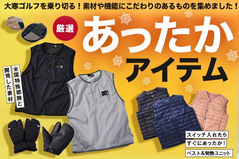 大寒ゴルフを乗り切ろう!【厳選あったかアイテム】一年で一番寒い『大寒』の時期は、ゴルファーにとってつらい時期。寒さに負けずに快適なラウンドにするためにも素材や機能にこだわったあったかアイテムは必至。そんなゴルファーにおすすめのあったかアイテムを揃えました。
