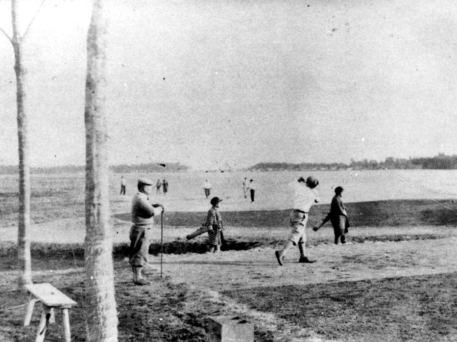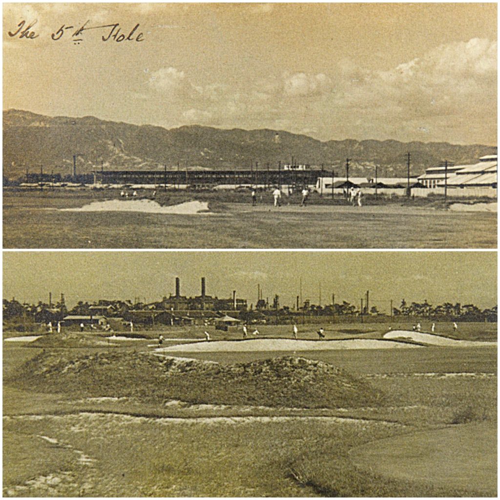 鳴尾速歩競馬場は1910年に廃止され1914年に鳴尾ゴルフアソシエーションが設立されたが土地の返還後解散。有志により1920年に鳴尾GCが設立。猪名川の新コースに移転するまで“鳴尾浜”でプレーが行われた。写真は1930年代の5番ホール(上)と8番ホール(下)