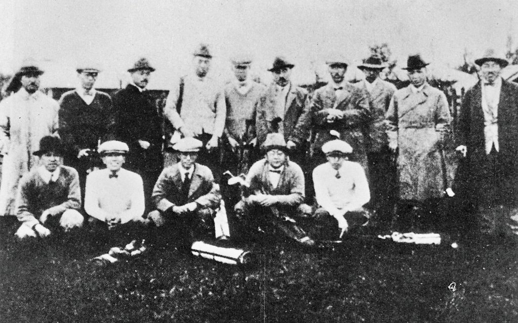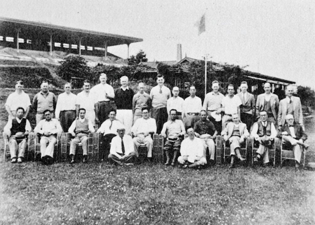 1927年創設当時の会員。前列右から2人目が君島一郎(1887~1975)。栃木県那須町生まれ。東京帝大卒業後に日本銀行入行。函館支店長時代に函館GC、岡山支店長時代は岡山霞橋GC(1930年)、門司支店長時代には門司GC(1934年)に関わった。野球研究者でもあり2009年に野球殿堂入りをした。後列左から2人目は平野信男