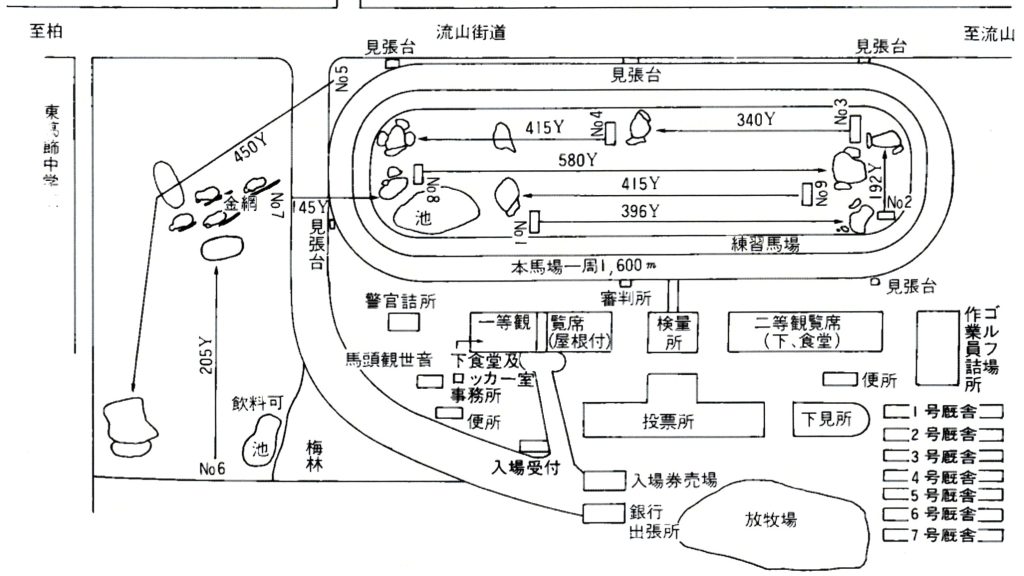 柏ゴルフ場のレイアウト。5、6番は本馬場の外にある。最長は8番で580ヤード(出典:「歴史アルバムかしわ~明治から昭和~」)
