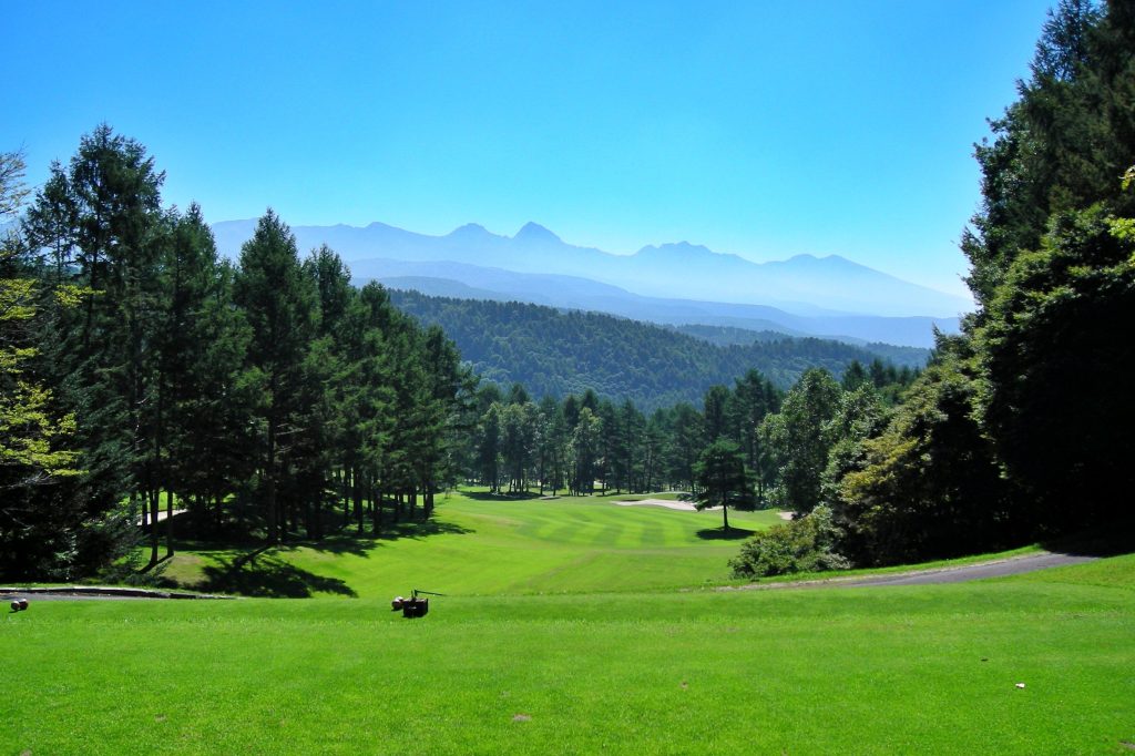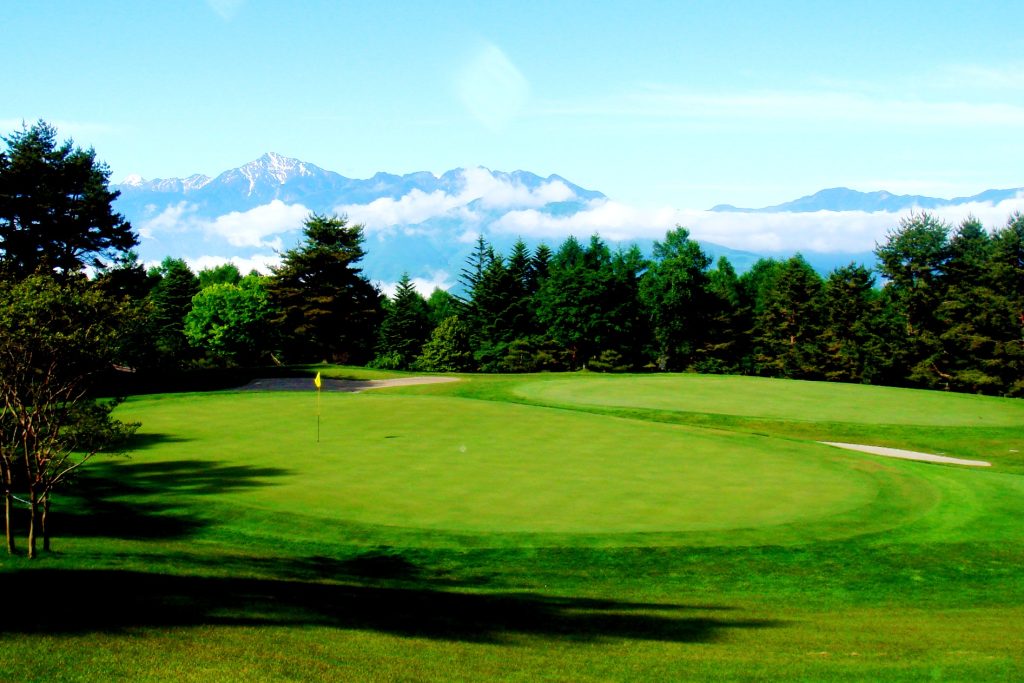 標高1500メートル以上の高原に展開し北アルプスの山並みを一望できる。フェアウェイは広く構えた時に目標を定めやすい。ベントのワングリーンは平均200坪と広く乗せやすいが3パットには注意。14番ホールは599ヤードのパー5。池越えの打ち上げでフロントからでも497ヤードと距離がありかなりハード。