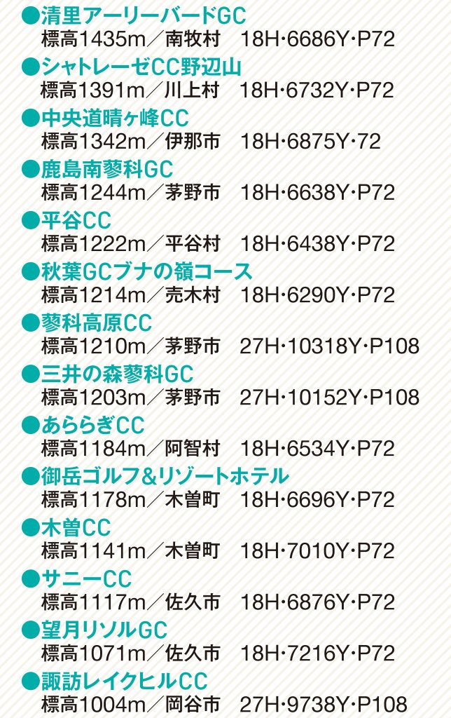 近年の夏の暑さは異常ともいえる厳しさ。夏のプレーを控えるゴルファーも増えているが、そんな人にもオススメなのが信州でのプレー。日本で標高1000メートル超のゴルフ場は48コースあるが、長野県内にはその半数以上の26があり日本一。この夏は信州で爽快感あふれる“天空のゴルフ”を楽しんでほしい。