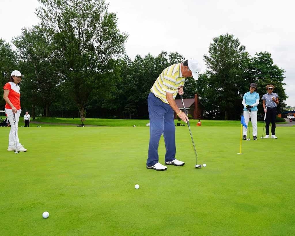 転がしやロブショットを解説付きで披露。参加者は、目の前で繰り広げられる正確無比なショットにくぎ付けとなった