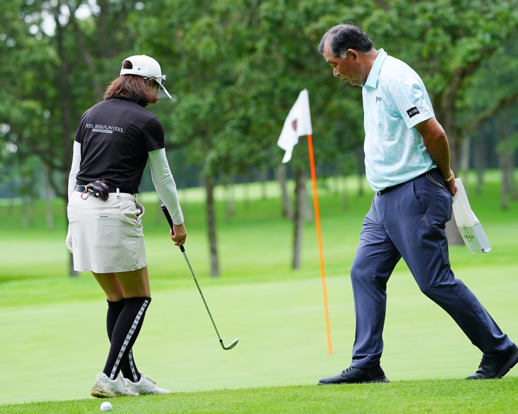 待っていた9番グリーンで、ラインが気になって様子を見に行く中嶋プロ。アカデミーの生徒を教えているかのような心配っぷり