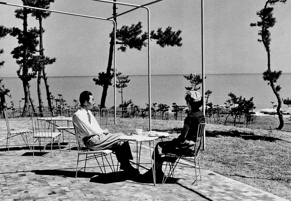旧クラブハウスのベランダでくつろぐ井上誠一。当時はハウスからも海がよく見えた