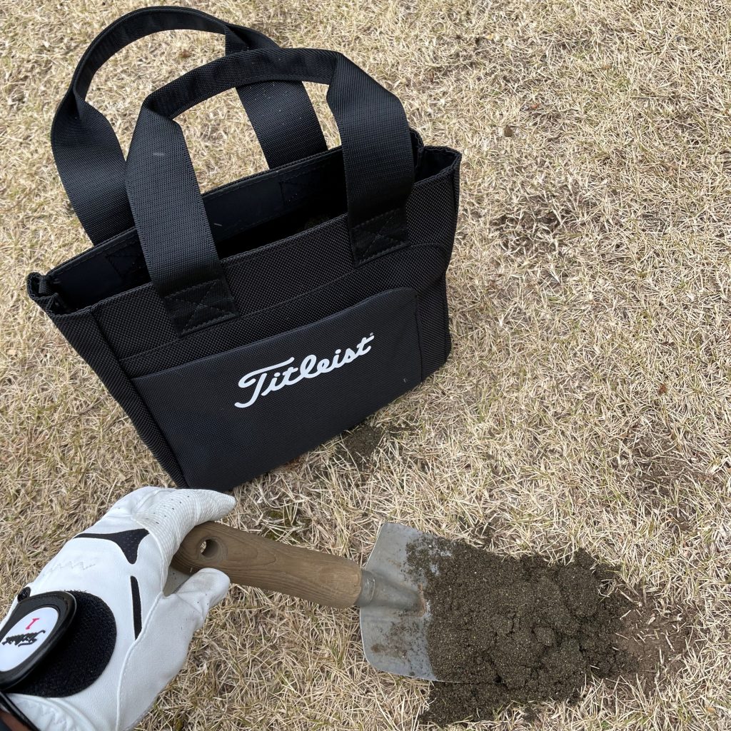 競技に限ったことではないが、目土袋を携帯し、ディボット跡に目土をする習慣をつけよう。芝生の保護の観点でも目土を迅速にすれば、早期に修復ができる。競技の時だけでなく普段から必ずやろう