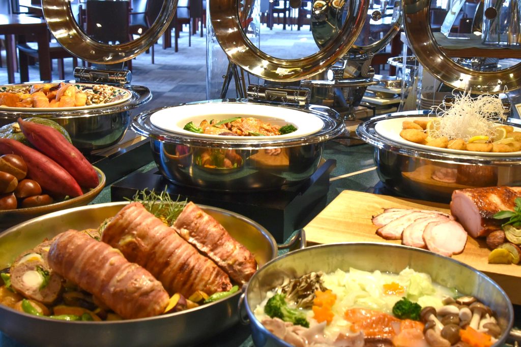 旬の素材をふんだんに生かした和洋中のメニューを週替わりで堪能できるランチビュッフェ。ホテルを併設しているため、ラウンド前の朝食ビュッフェやラウンド後の夕方から利用できるディナービュッフェも楽しむことができる