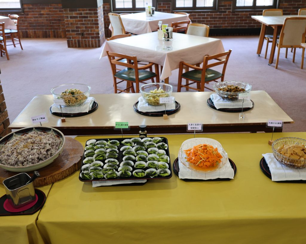 旬の食材を使った手作りビュッフェが人気。出来立てのご飯と漬物が自慢。
