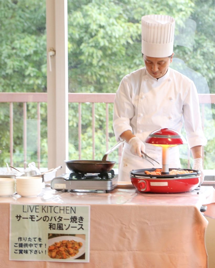 毎月更新されるメニューは、旬の食材を生かし季節感を味わうことができる。シェフが目の前で調理する「ライブキッチン」は期間限定で開催され、絶大な人気を誇る