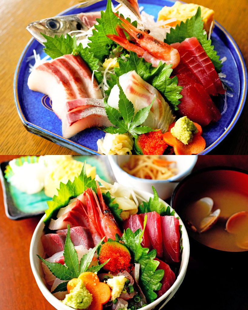 上:お刺身御膳(3000円)/下:山武おまかせ丼(3000円)