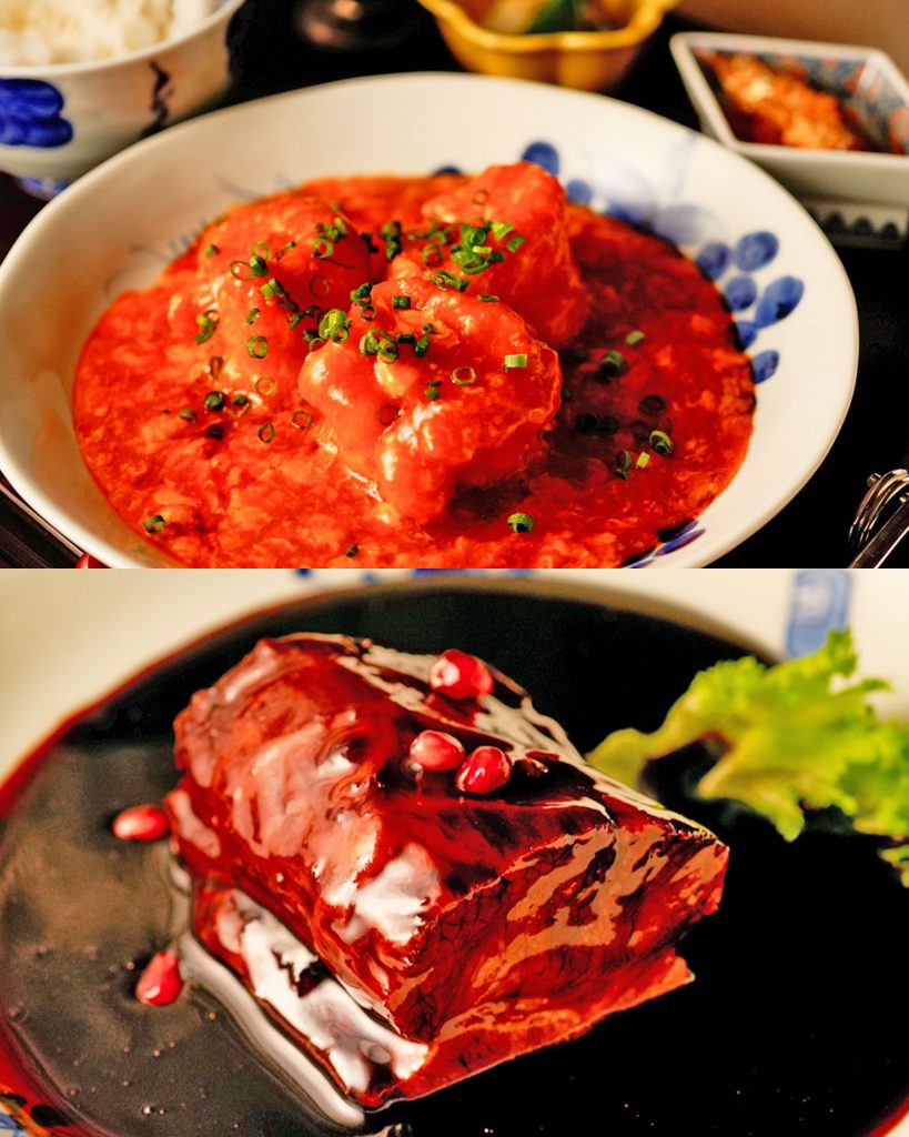 上:乾焼蝦球[カンシャオシャーチュー](2900円)/下:黒酢の酢豚(2800円)