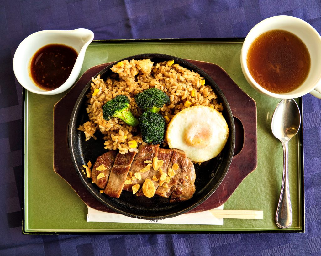 食事メニューも工夫がたくさん。人気は「鉄板ビーフガーリックライス」(通常1990円、昼食補助付き780円)。体を動かす日はモリモリ食べたいという人が多い