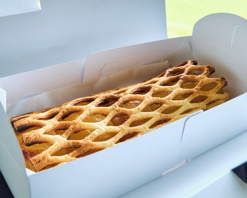 お土産で人気の「アップルパイ」(1500円)は、昼食時に注文しておくと焼いてくれる。パイ皮がサックサク、中にはりんごがたっぷり