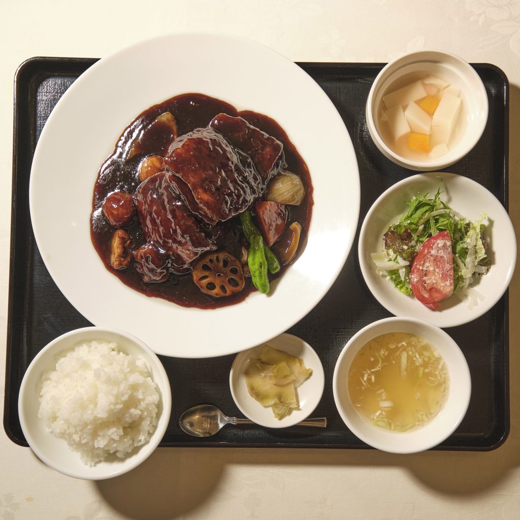 スープ、ザーサイ、サラダ、杏仁豆腐付き。ボリュームがあるため、複数人でシェアする人もいるという