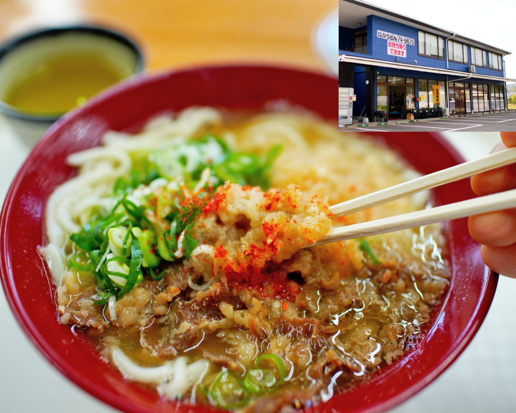 朝5時半から営業しているうどん屋。宮崎のうどんはコシが少なくやわらかい“やさしさ”が大きな特徴。ゆえに、朝からバクバクいける!「肉うどん+天かす」(640円)(宮崎県宮崎市佐土原町東上那珂548-7)