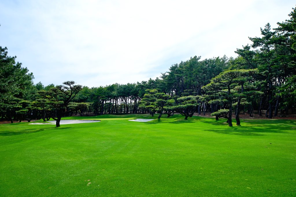 コースは松林に囲まれた林間コースだが、フェアウェイの傾斜がキツく、どのホールも一筋縄ではいかない。この4番ホールは567Yのパー5だが、トーナメントでは512Yのパー4として使用された。