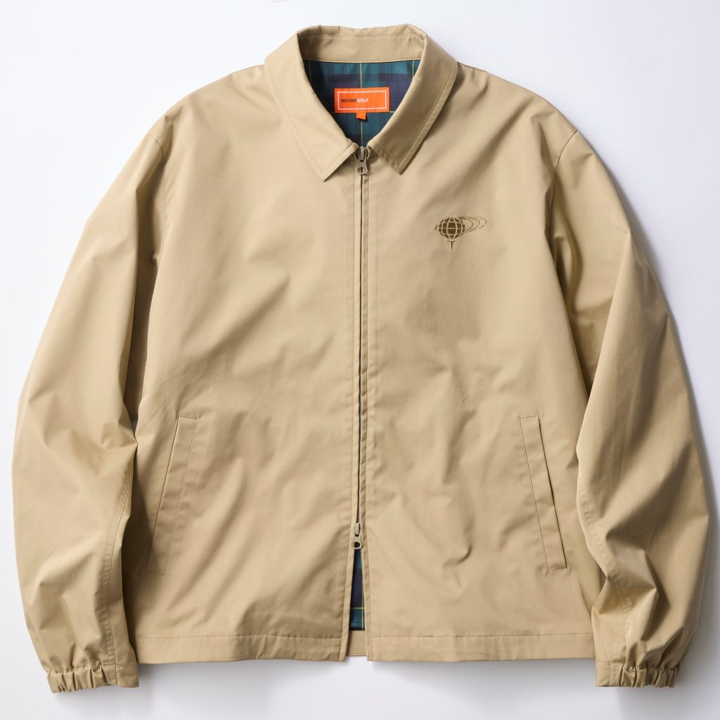 同色ロゴがさりげない、オールマイティに使えるベージュのストレッチジップブルゾン。ナチュラルな光沢感も◎。裏地部分のブラックウォッチ柄がアクセントとなっている ●3万1900円(ビームス ゴルフ)