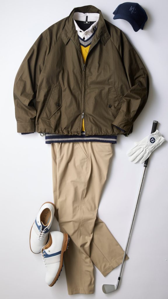 ブルゾン2万9700円(バラクータビームスF)、セーター2万6400円、パンツ2万2000円、キャップ7150円(すべてビームス ゴルフ)、ポロシャツ1万6500円、グローブ2200円、シューズ4万4000円(すべてフットジョイ)