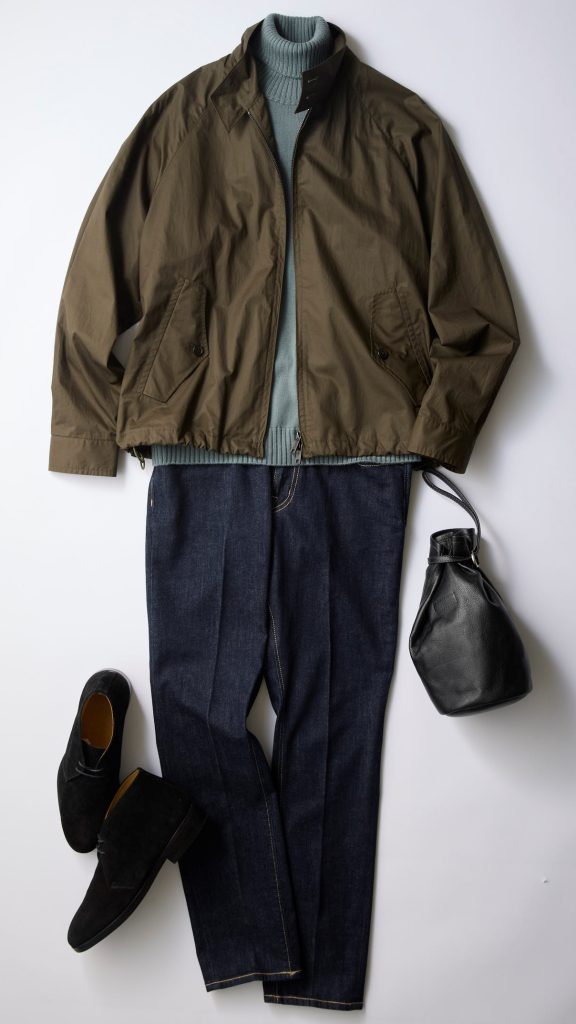 通称“ドライビングコート”と呼ばれる定番〈G4〉ブルゾン。こなれたカーキブルゾンと華やかなマスタードのVネックセーターの組み合わせがトレンド感のあるアイビーテイストを醸し出している。王道のチノパンのベージュも流れるようなトーンバランスを構築。