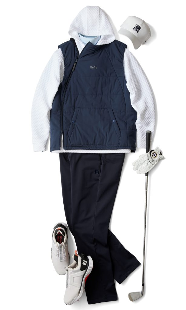 ●ベスト2万3100円(トラヴィスマシュー)、●キャップ4730円(キャロウェイ)、●フーディ1万7600円、●モックネックシャツ1万7600円、●パンツ1万7600円、●グローブ3300円、●シューズ2万9700円(すべてフットジョイ)