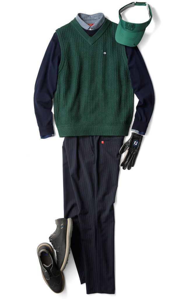 ●ベスト1万2100円(フィドラ)、●クルーネックセーター3万6300円)、●ポロシャツ2万1450円、●パンツ3万800円(ともにキャロウェイ レッド レーベル)、●サンバイザー7150円(ビームス ゴルフ)、●グローブ2200円、●シューズ 参考商品(ともにフットジョイ)