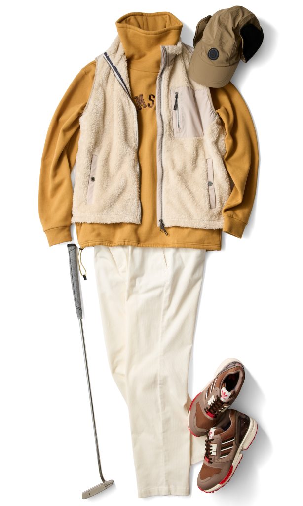 ●ベスト4万2900円(ヒールクリーク)、●スウェットシャツ2万6400円(ビームス ゴルフ)、●パンツ1万1990円(キャロウェイ)、●キャップ1万1550円(ブリーフィング ゴルフ)、●シューズ オープン価格(アディダス ゴルフ)