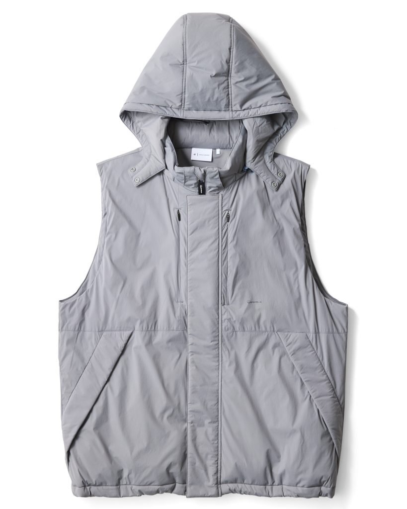 全方向にストレッチ性を発揮する『3DeFX』素材を採用したネイビーの中綿ベストは斜めのジップがユニーク。ワッフル素材の白フーディと爽やかなスカイブルーのモックネック、シックなネイビーパンツを合わせることで上品スポーティなスタイルが完成する