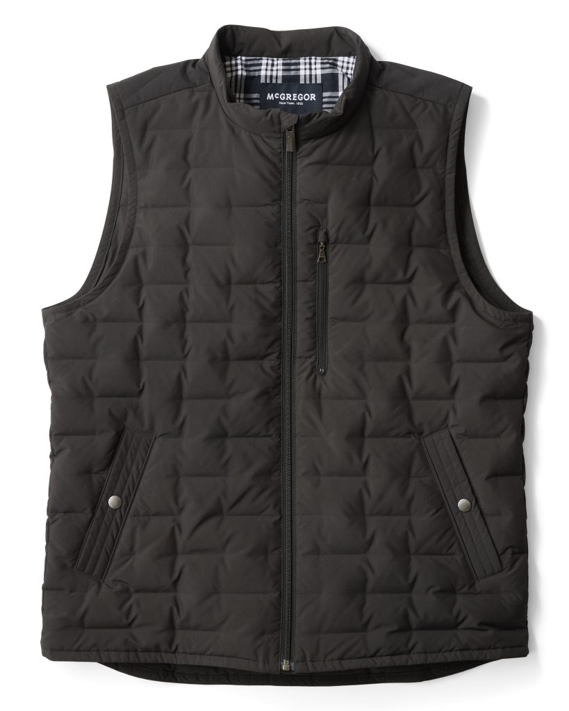 首元から覗くチェック柄もアクセントのシンプルシックなブラック。中綿の入れ方もスウィングの動きを妨げないよう計算された一枚に仕上がっている ●2万7500円(マックレガー)
