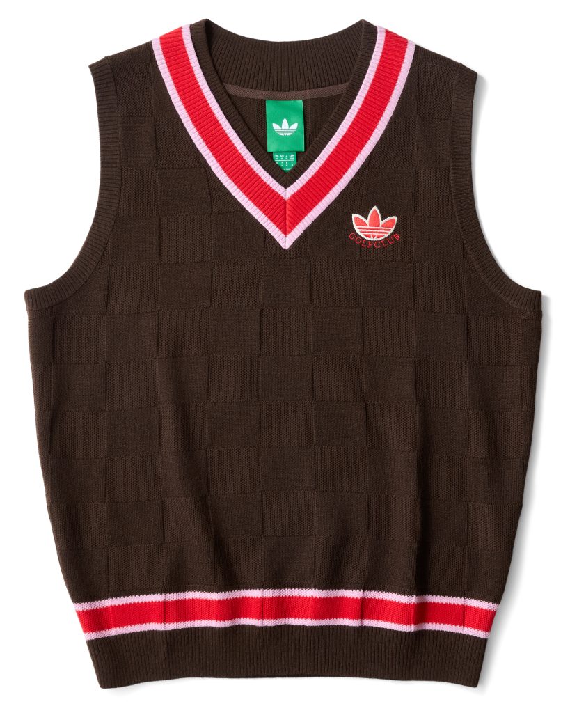 ポリエステルとウールの混紡素材によるチルデンベスト。ブラウンをベースにしたクラシカルな雰囲気ながら、今っぽいシルエットやブロック柄がさえる ●1万9800円(アディダス ゴルフ)