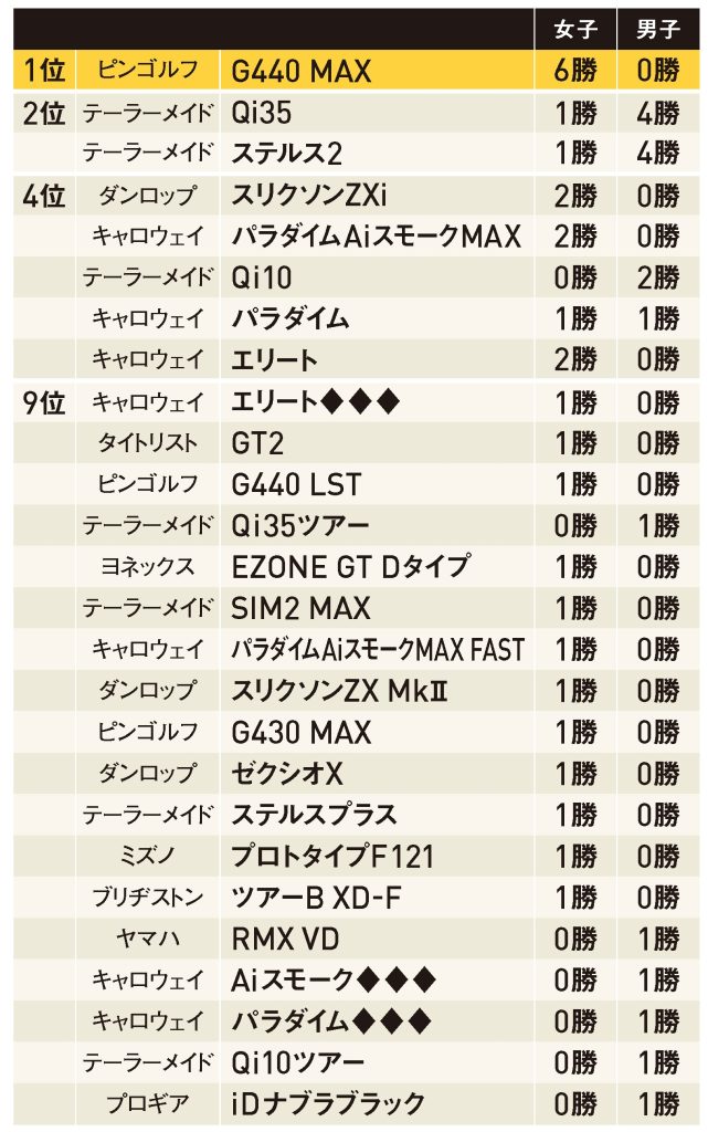 モデル別では女子で6勝を挙げていて、アマチュアにも人気の「G440 MAX」がトップ。そしてロフト15度の3Wの代わりにロフト16度~17度の3HLや4Wを使用する選手が国内ツアーでも増えてきた。阿久津未来也、比嘉一貴、河本結、菅沼菜々、工藤遥加が使用して優勝している。打ち出しが高くやさしく飛ばせ、さらに高さで球を止められるのが人気の理由だろう。もはやスプーンも飛ばすだけでなく、グリーンを狙うための性能も求められているようだ。