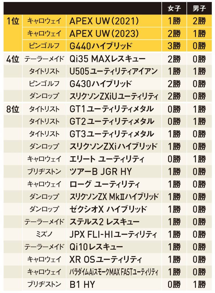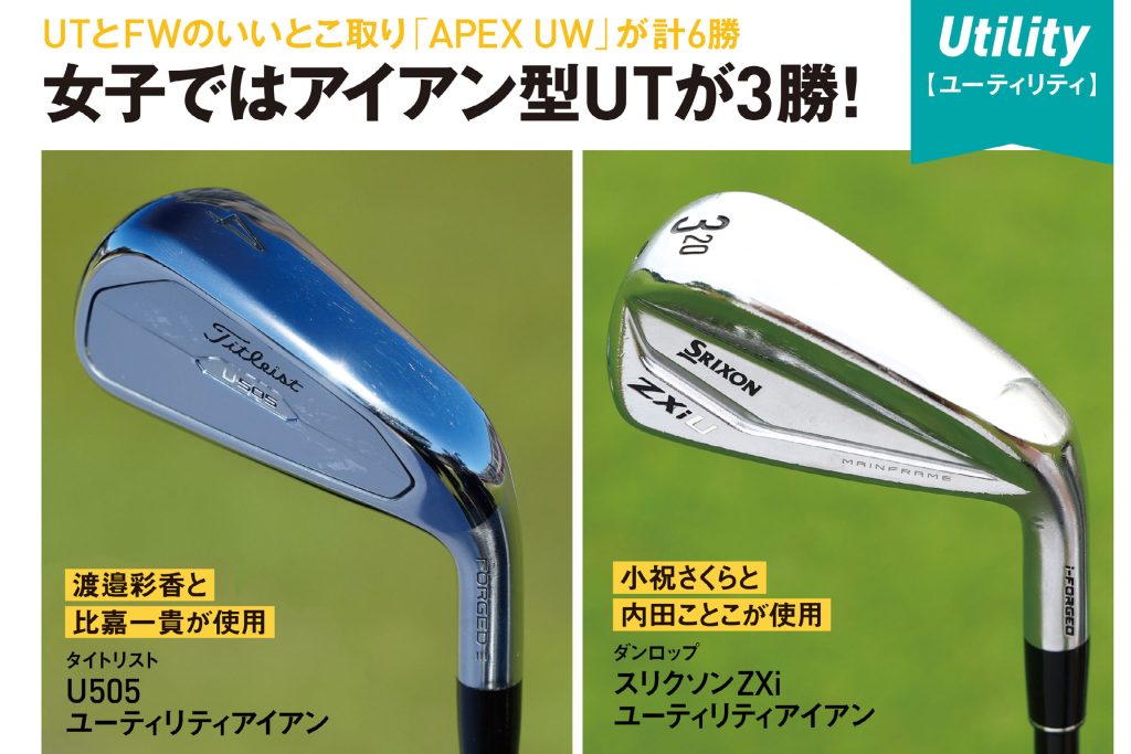 フェアウェイウッドの飛距離性能とユーティリティの操作性・コントロール性能を両立させたキャロウェイ「APEX UW」が勝利数でトップ。またアイアン型ユーティリティはパワーが必要なイメージがあるが、女子でも小祝さくら、内田ことこ、渡邉彩香が使用して優勝。小祝、内田は元々ウッド型を使用していたが、小祝は全英女子オープン対策で弾道が抑えられることから、内田はつかまりすぎて左に行きやすかったことから、アイアン型にスイッチした。