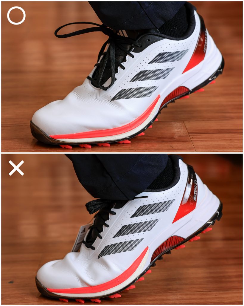 スニーカー感覚で大きめを選ぶ人も多いが、ゴルフシューズでは絶対NG。また「脱ぎ履きがラク」という基準も、1ラウンド5~6時間履くシューズのわずか1分の手間を優先するのは理にかなっていないと織畠さん。