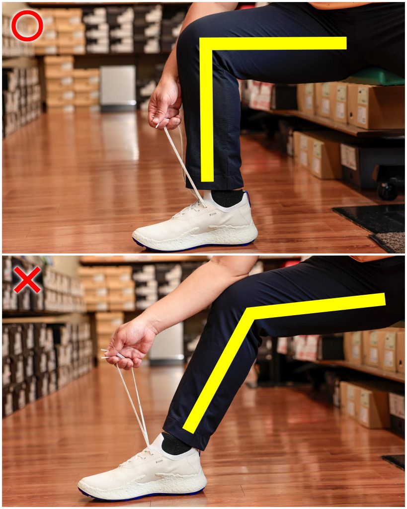 ヒモを締める際、ひざが伸びた状態だとかかとの位置がズレやすい。ひざが直角になるように座るか、できない場合はつま先を上げた状態でヒモを締めよう