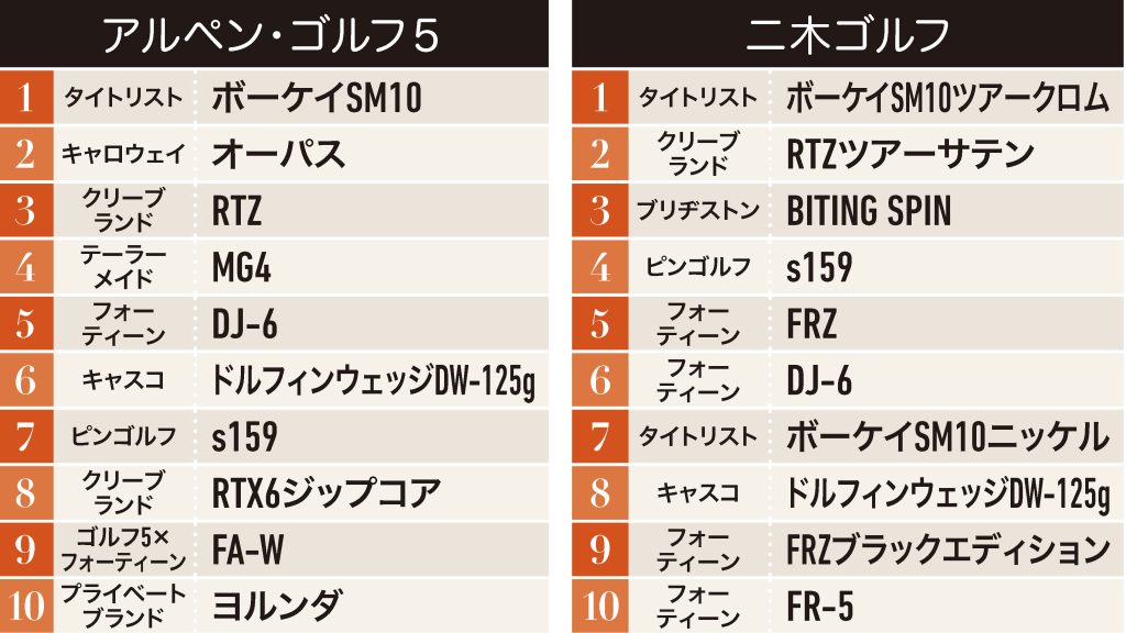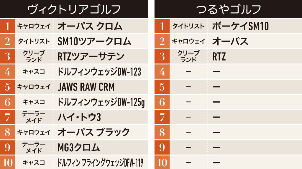 昨年3月に発売された「ボーケイ10」も相変わらずの人気で「アルペン・ゴルフ5」、「二木ゴルフ」、「つるやゴルフ」で1位を獲得したものの、「ヴィクトリアゴルフ」ではキャロウェイの「オーパス」に1位の座を奪われた。フォーティーンやクリーブランドも健闘するなど、まさにウェッジ戦国時代に突入したもようだ
