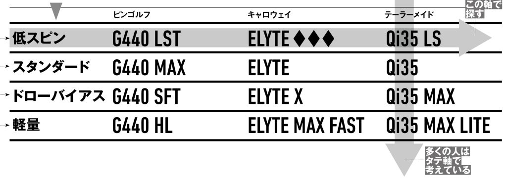 「いまよりもスピンが減れば飛ぶのか、球がつかまれば飛ぶのか、軽く振り抜ければ飛ぶのか。スペック選びよりも先にこの方向性を考えること。いまよりもつかまりがよくなれば飛ぶ可能性が高いスライサーなら、まずは『ドローバイアス』のものをチェックして、そのうえで他のものと比較することで、“迷子”になるリスクは減らせるはずですよ」