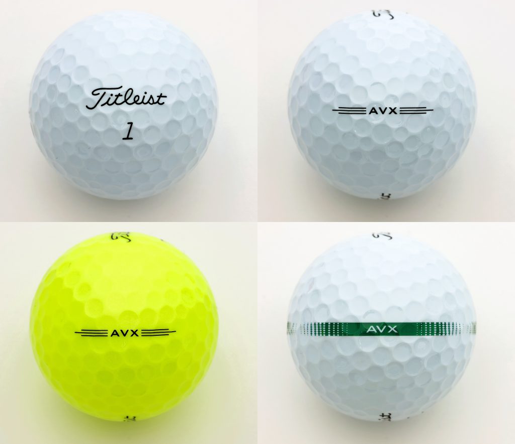 新AVXは、白と黄色と深緑色の帯が入ったエイム360°の3つがある。“Titleist”のロゴはプロV1ファミリーと同じ細めの書体になっている。