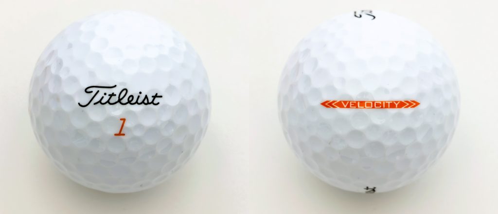 新VELOCITY(ベロシティ)。写真の白以外にオレンジとグリーンがある。低スピンの鋭い弾道で飛距離性能に特化したアイオノマー・カバーになっている。