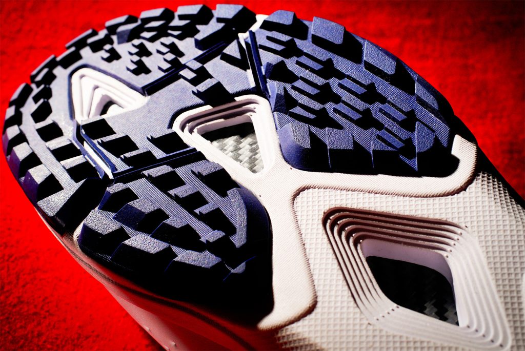 アウトソールの前足部にある大きなへこみ「ターフバイトポケット」。周りのラバー突起が芝に絡まることでグリップ力が向上