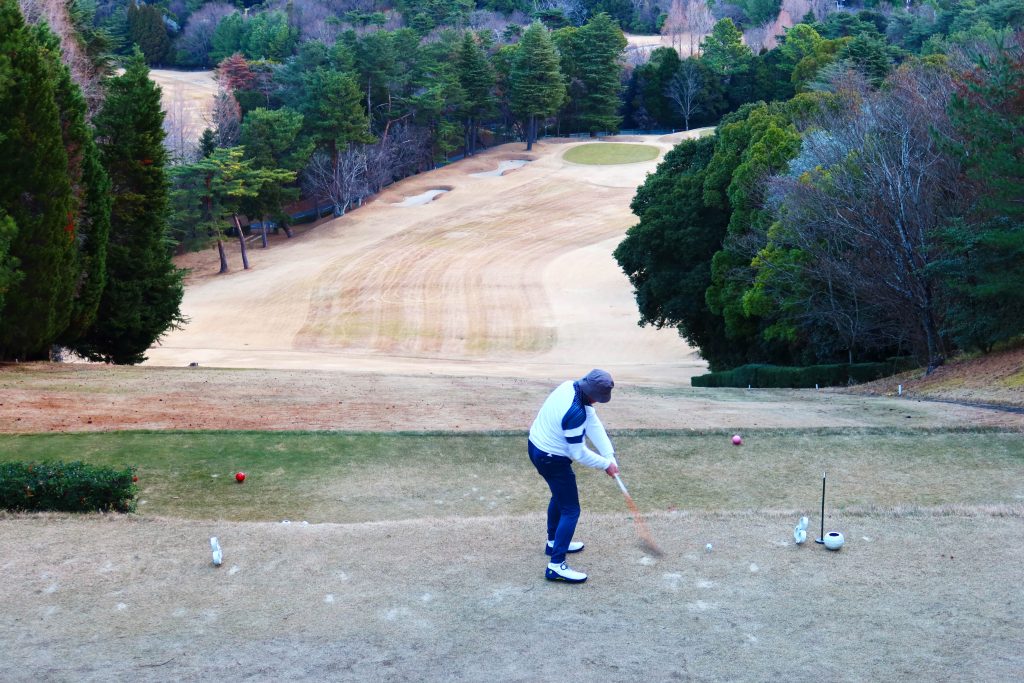 昨年の第9回は早朝雪が降りしきる中での開催だったが、今年は晴天。しかし代わりに参加者を悩ませたのが、風速8mの強風。折しも「オーイ! とんぼ」の連載最新話では舞台がスコットランドに移り、とんぼが強風の中プレーしているが、まさにこの日はスコットランドのリンクスを彷彿とさせるような風が飛鳥の地に吹き荒れた。