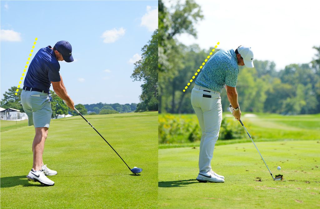 ドライバーはより直立に近いのに対し、アイアンのほうは前傾角度がより深くなっている