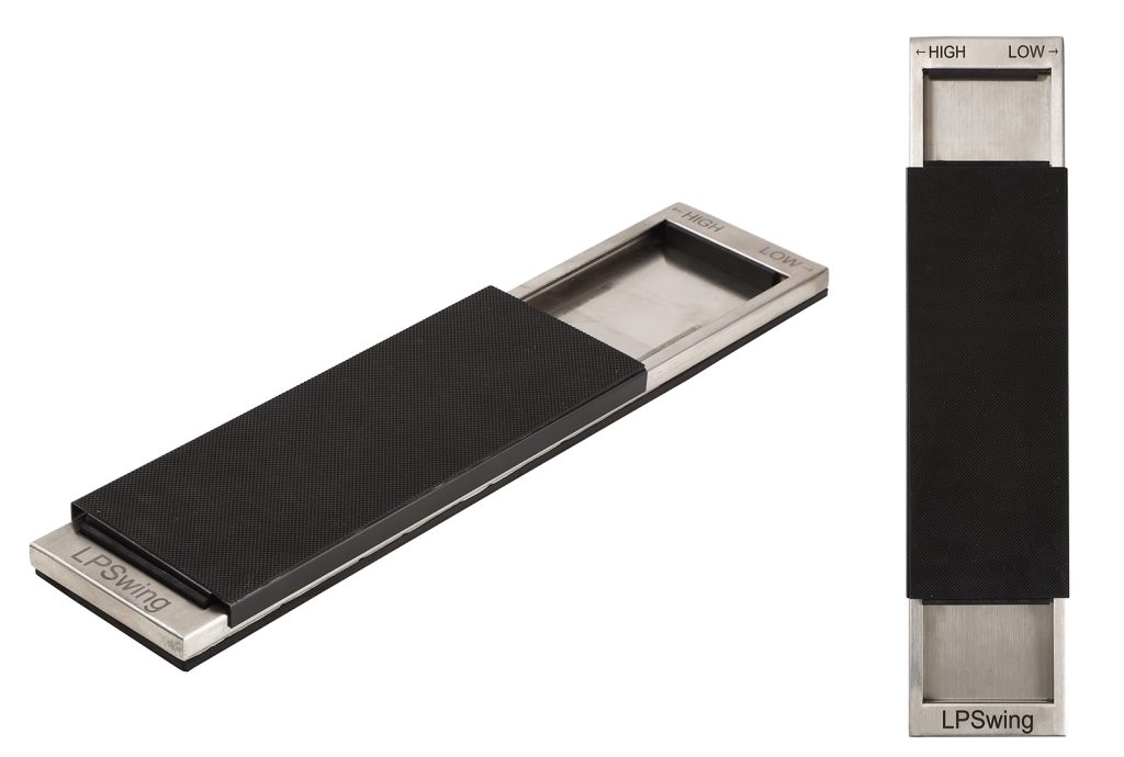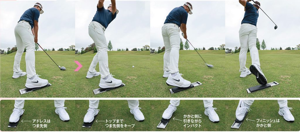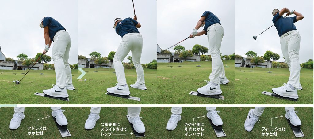 「左足をパワースライダーに乗せて、スライダーをかかと側にセットします。スライダーをつま先側に移動させながらテークバック。トップではつま先側のポジションです。ダウンスウィング以降はかかと側にスライドさせて、インパクト、フィニッシュを迎えます」