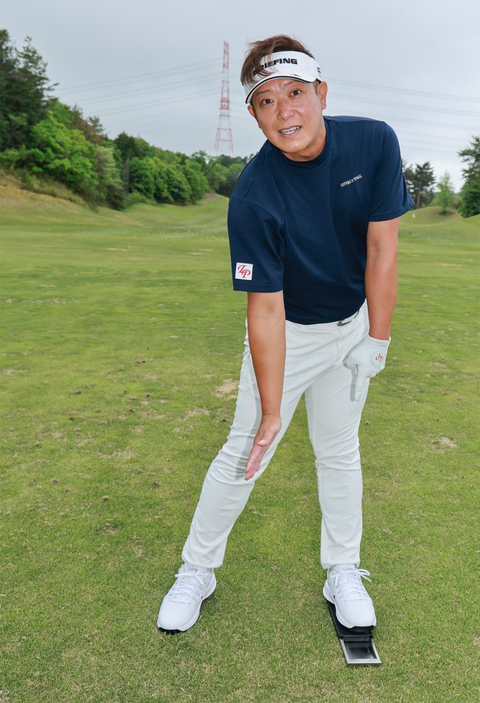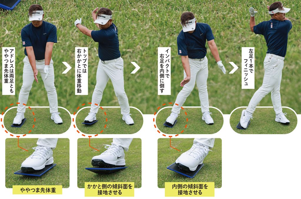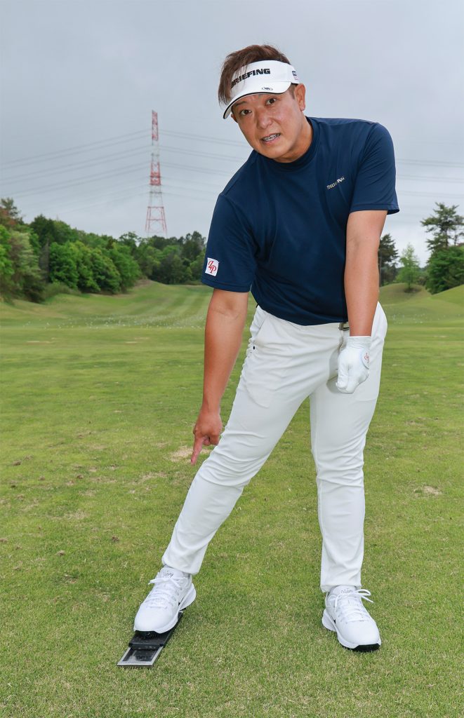 「右足を乗せて、スライダーをつま先側にセットします。スライダーの位置をトップまでつま先側にキープして、右足を後ろに引きながらインパクトします。右サイドにふところができて、体の開きが抑えられるため、アウトサイドイン軌道を修正することができます」