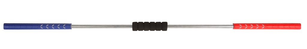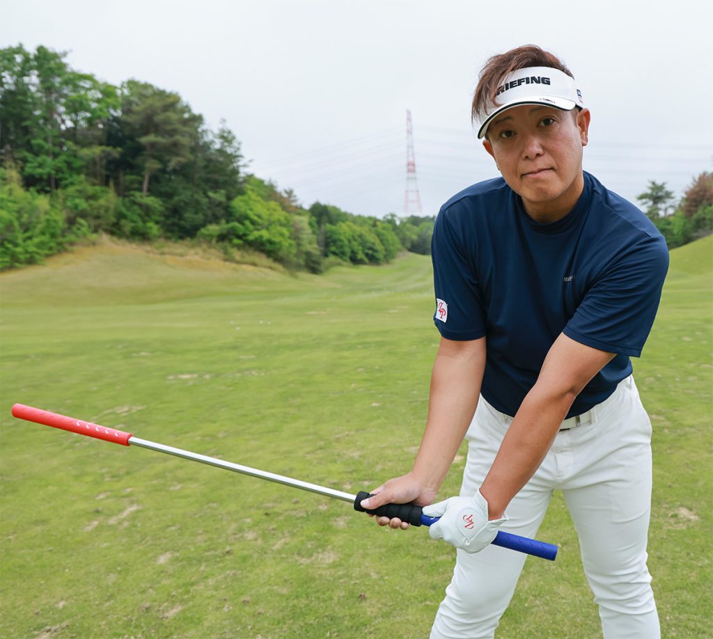 「長く余らせた青グリップが体に当たらないように振ることで、正しいハンドファーストのインパクトがわかります。正しいハンドファーストは、インパクトゾーンを長くする効果もあります」