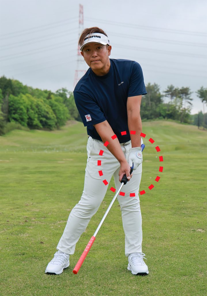 「右手で握った黒のスライドグリップを滑らせながら上げることで、自然に右肩がしっかり回った理想的なトップになります。肩の回転が不足した浅いトップを解消するにはピッタリです」