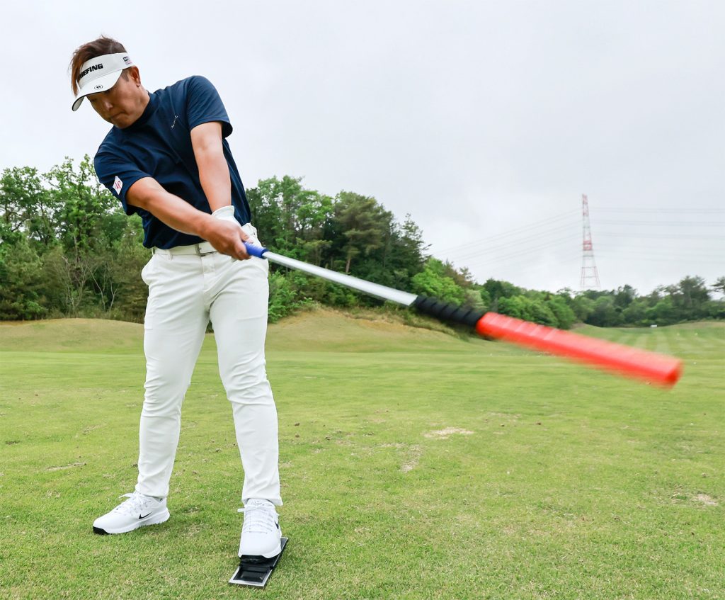 吉田 この練習で感じてほしいのは、腕を振るスピードではなく、地面反力をスピードに変換させるタイミングです。どのタイミングでどこに力を入れると、より小さなチカラでスピードを上げられるか、クラブを振るよりわかりやすくなりますよ。