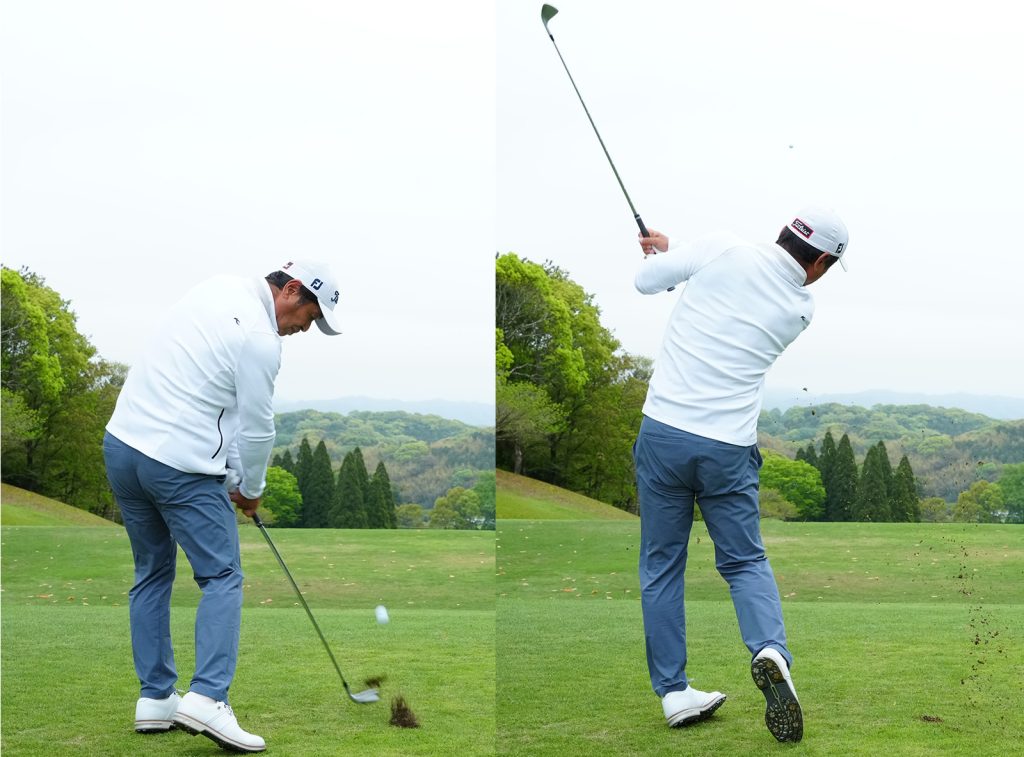ドローもフェードも曲がりが大きくなれば、その分キャリーと飛距離は落ちてしまう。そこで、普段なら7番で届く距離だとしても、曲げ幅によっては6番や5番で打つ必要が出てくるということ(写真は6番アイアンの大きなフェード)