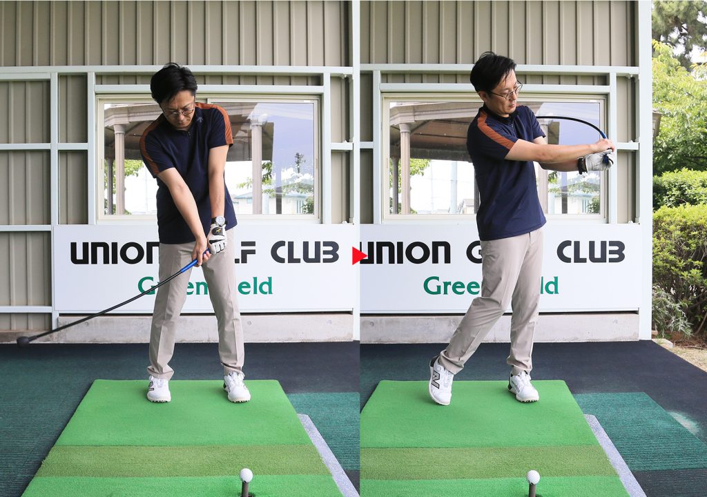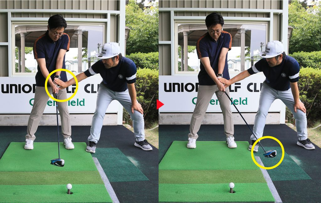 橋爪 ダウンスウィングでヘッドには遠心力がかかっていますから、手元側が急に止まるとヘッドが勝手に走るんですね。ボールがつかまる感覚がわかったら、次は体を大きく回すことを意識すると、だんだん球筋が真っすぐになります。